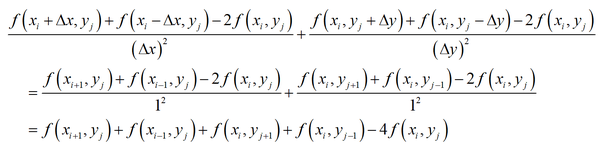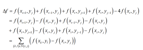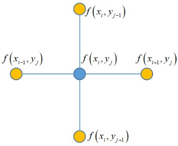 这是一个非常优美的结果,它就是 (x_{i},y_{j}) 的4个相邻点处的函数值之和与 (x_{i},y_{j}) 点处的函数值乘以4后的差值。如下图所示
