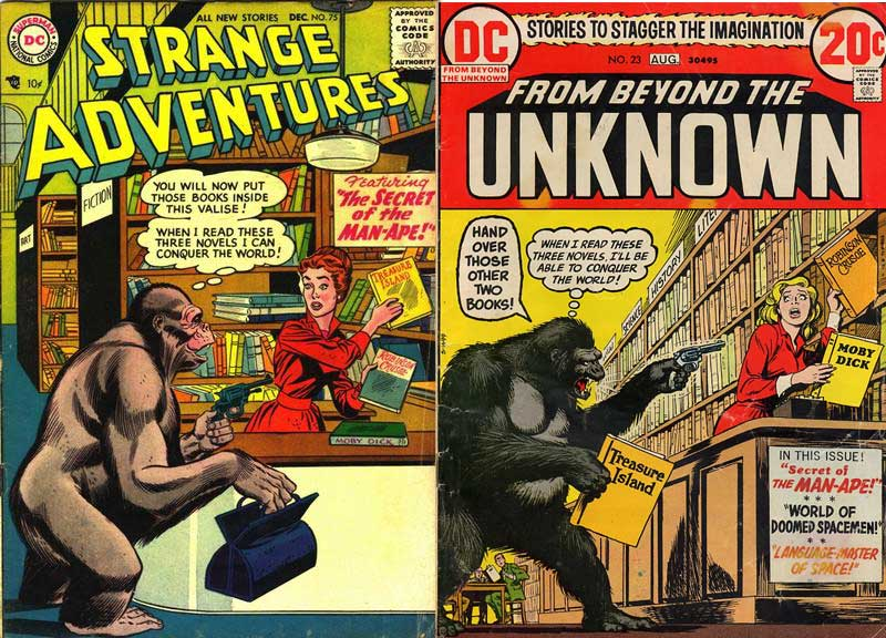 就如斯坦·李和John Buscema在《How to Draw Comics the Marvel Way》中所说,前者的作画风格当然没什么问题,只不过后者更有感染力,注意这几个细节:右图中猩猩的大腿张得更开,图书管理员从肢体和表情上表现出了更多的恐惧感,而且还有背景里的人的反应。简单来说,右图的封面充满了漫威的风格。