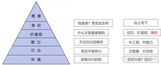 (比如你是一个项目的负责人,你发现项目里其他部门的人配合的不好,这个时候如果你没考虑清楚问题出在哪个层次,是很难搞定的,你一味的要求大家开会,投入时间,补充能力,或许你会发现,原来很多人在价值观层面有问题——他认为就做不成,或者身份层面出问题——认为就不该是他做等,所以当务之急要先解决高层次问题,再解决低层次的)