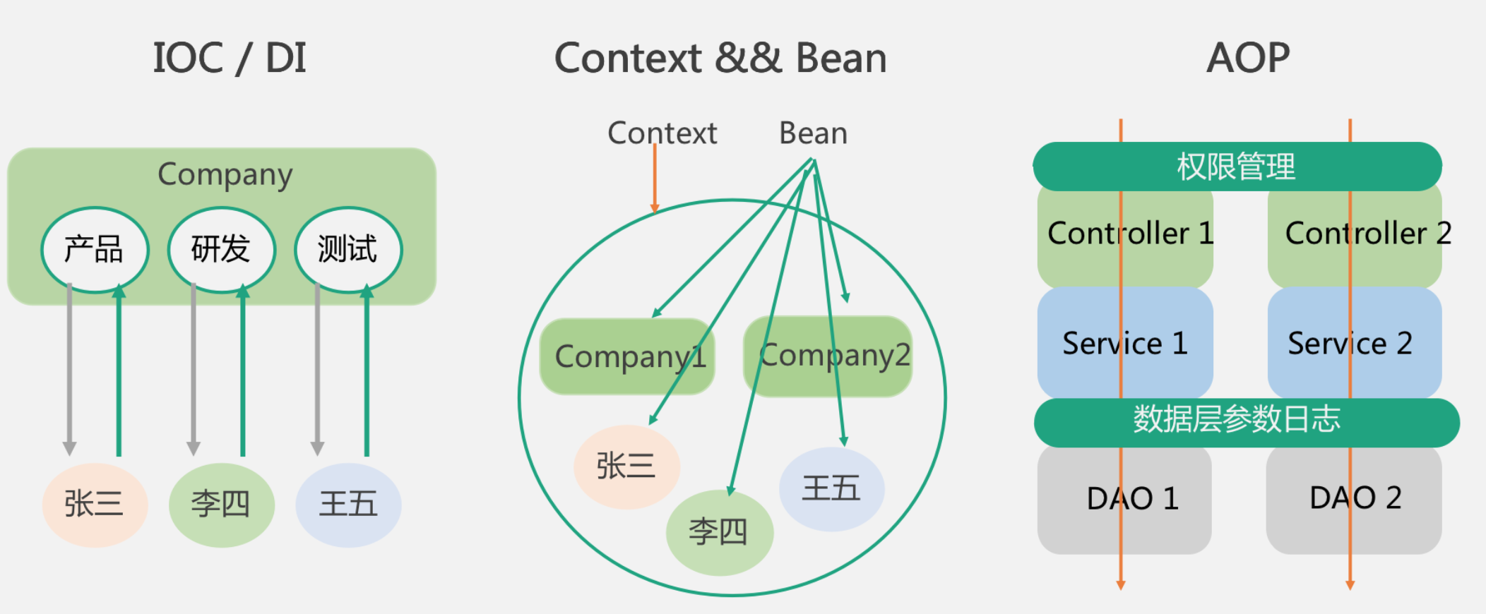 如中间图所示,所有被spring管理的、由spring创建的、用于依赖注入的对象,就叫做一个bean。Spring创建并完成依赖注入后,所有bean统一放在一个叫做context的上下文中进行管理。