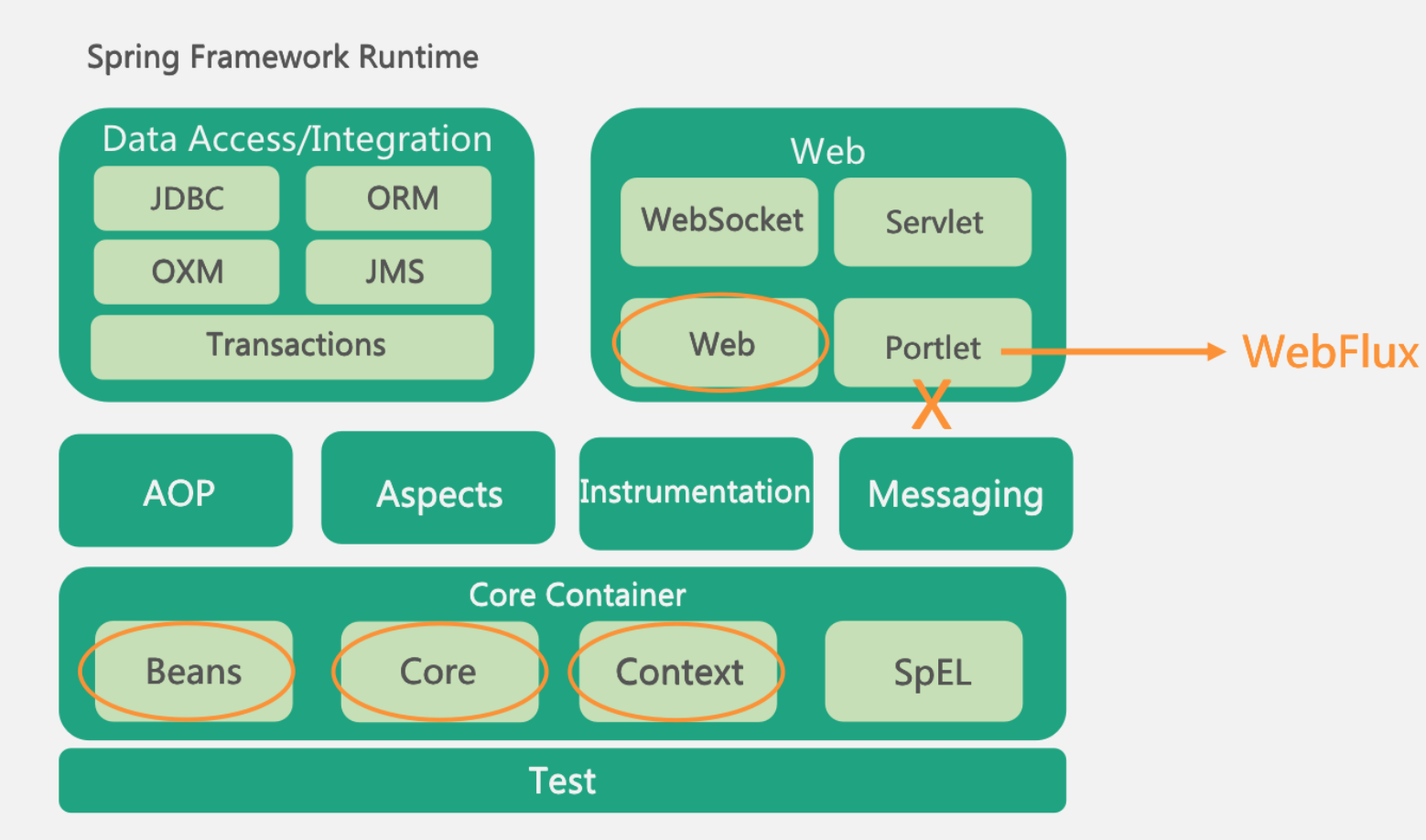 上图列出了spring框架主要包含的组件。这张图来自spring4.x的文档。目前最新的5.x版本中右面的portlet组件已经被废弃掉,同时增加了用于异步响应式处理的WebFlux组件。