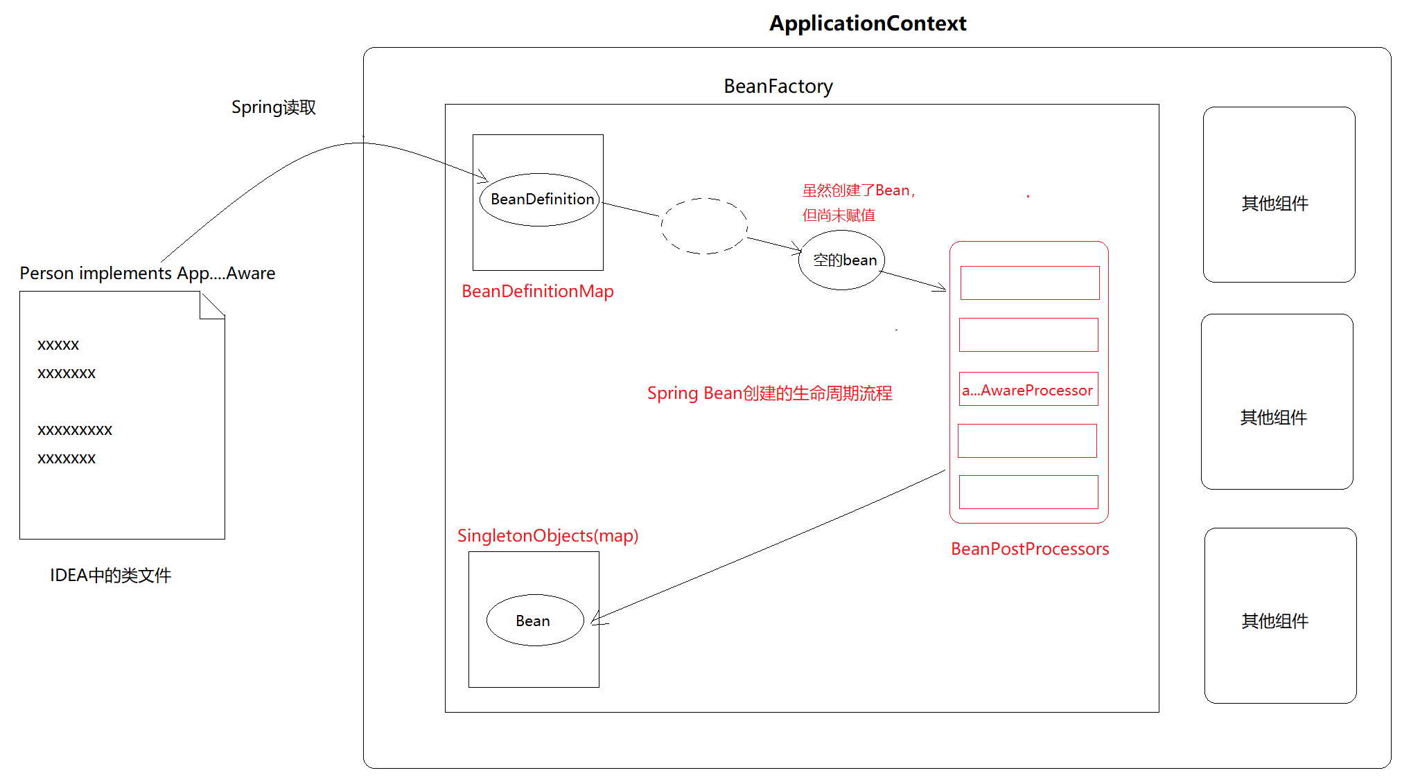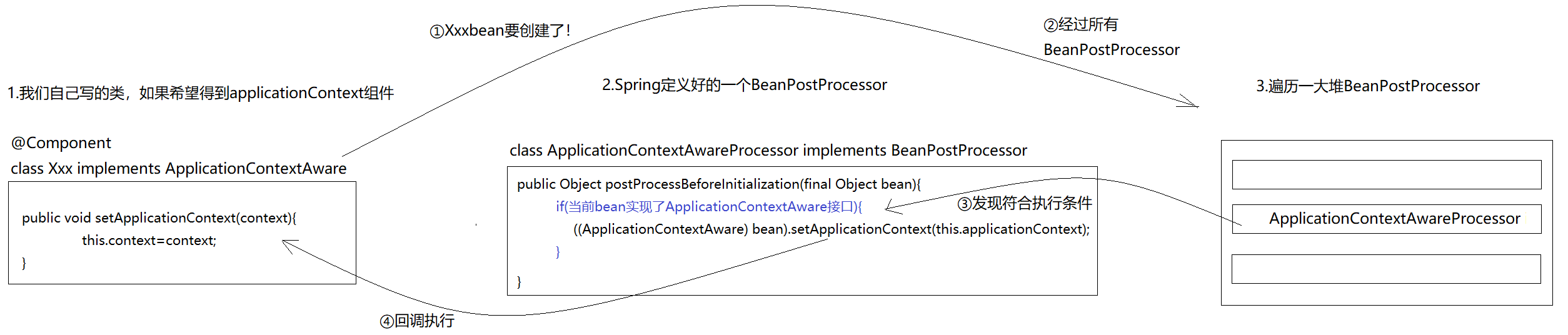 就是说啊,明面上我们看得见的地方只要实现一个接口,但是背地里Spring在自己框架的某一处搞了个for循环,遍历所有的BeanPostProcessor,其中就包括处理实现了ApplicationContextAware接口的bean的后置处理器:ApplicationContextAwareProcessor。