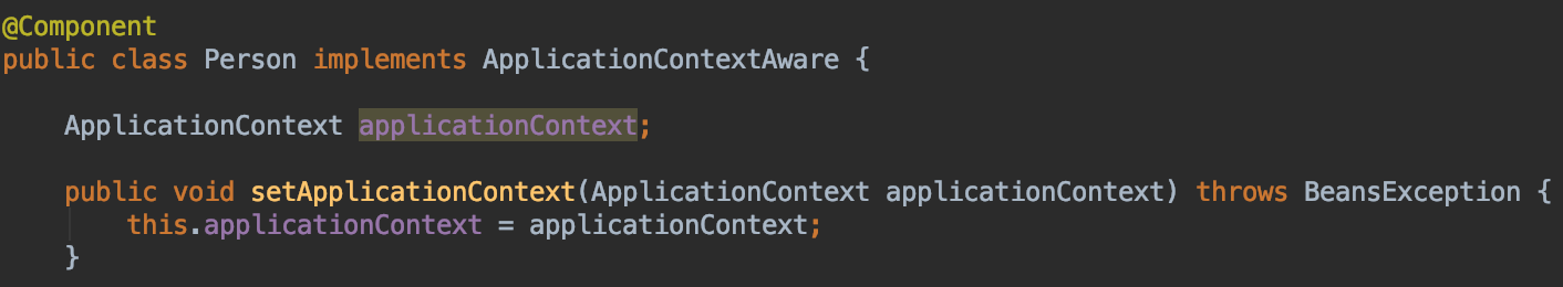 后期,Spring会调用setApplicationContext()方法传入ApplicationContext实例。