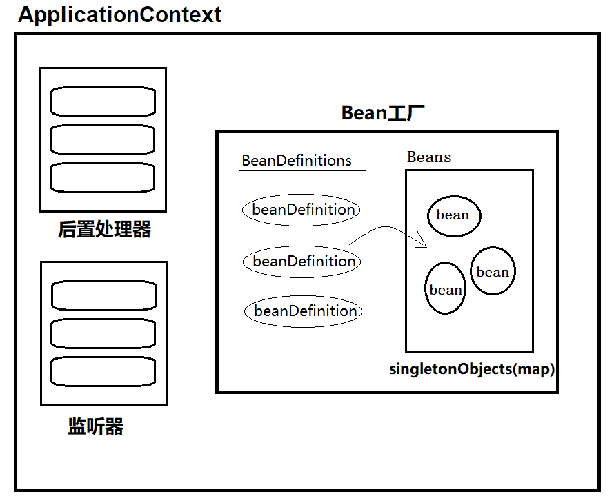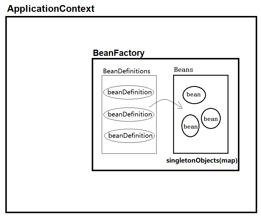 大部分人把Spring比作容器,其实潜意识里是将Spring完全等同于一个Map了。其实,真正存单例对象的map,只是Spring中很小很小的一部分,仅仅是BeanFactory的一个字段,我更习惯称它为“单例池”。