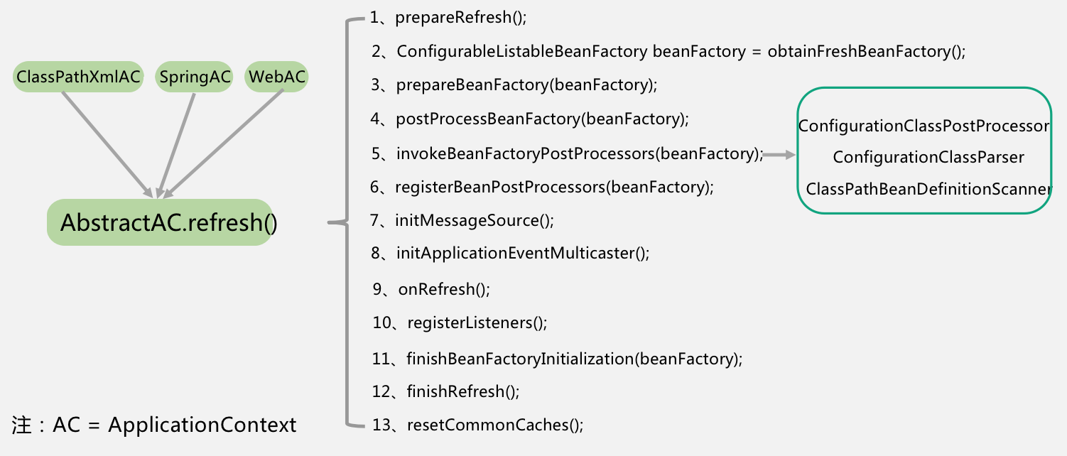 图中左上角是三种类型的context,xml配置方式的context、springboot的context和web服务的context。不论哪种context,创建后都会调用到AbstractApplicationContext类的refresh方法,这个方法是我们要重点分析的。