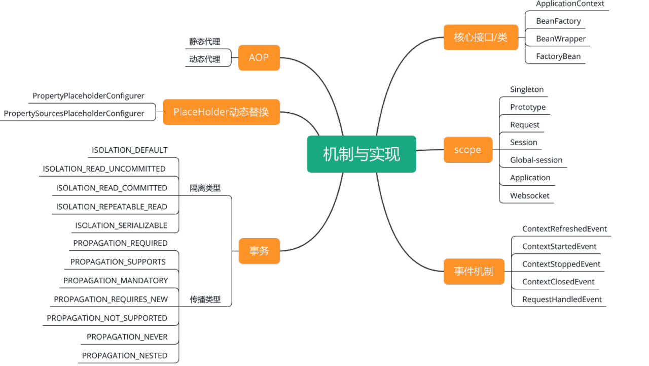 spring的事件机制需要知道spring定义的五种标准事件,具体事件可见上图,了解如何自定义事件和实现对应的applicationListener来处理自定义事件。