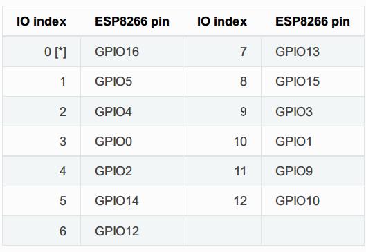 使用MicroPython操作IO的时候需注意,MicroPython的固件是针对ESP8266的,不是针对NodeMCU的,因此,其Pin的编号是ESP8266的GPIOx,而不是NodeMCU板子上的Dx。下面的例子就是对板载LED进行操作。NodeMCU文档有这样一个表格:
