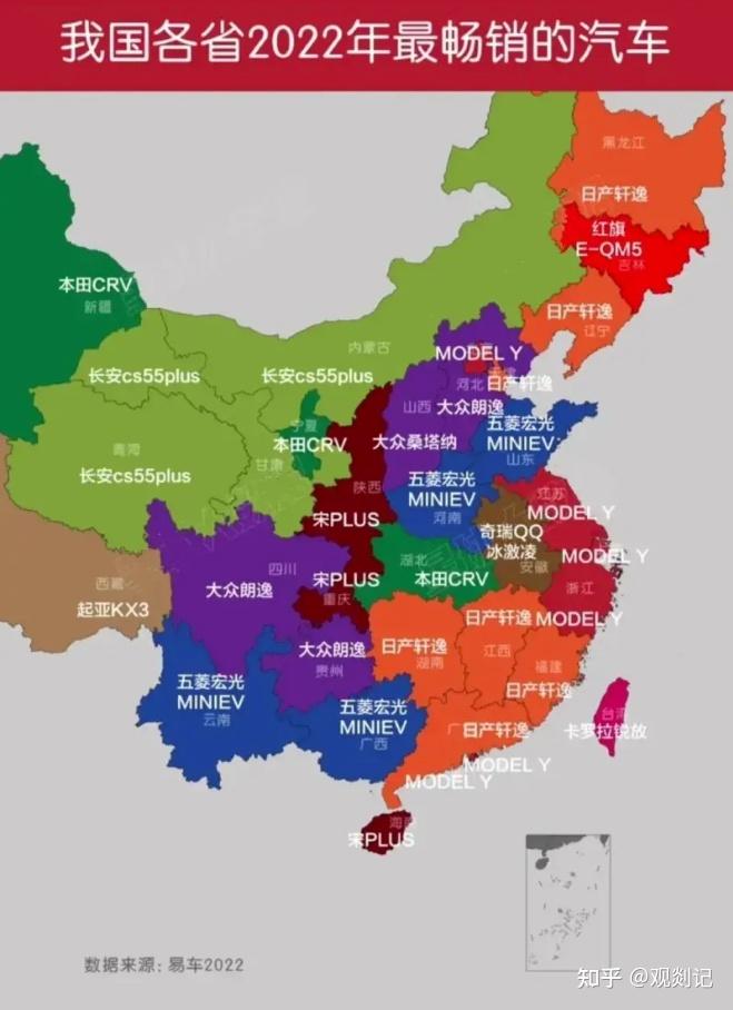 2022年各省最畅销汽车品牌,日产轩逸特斯拉超过比亚迪五菱宏光
