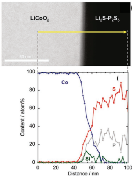 来自大阪府立大学的学者[8]借助STEM技术对LCO/Li2S-P2S5 界面进行了HAADF形貌成像和EDS元素线分析。在阴极/固态电解质界面发现Co、P、S的相互扩散,这一元素相间扩散行为导致LCO电极和固态电解质在界面处均发生降解,是导致全固态锂电池界面电阻增大的原因。
