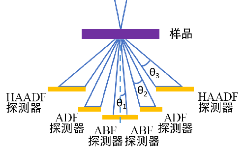入射电子束与样品中的原子相互作用产生弹性散射和非弹性散射,这些散射电子携带有关于样品的信息,如图3所示,在样品下方的不同位置,环形探测器收集到的不同的信号分别用于不同的成像模式。