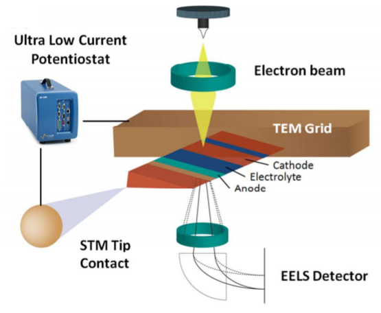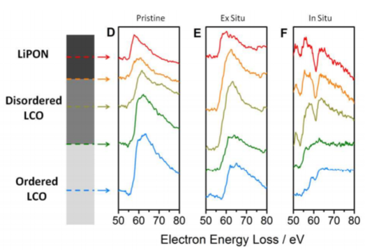 加州大学的王梓莹等人[7]在研究全固态锂电池(ASS)时搭建了如图6所示的原位STEM观察装置,使用原位STEM-EELS结合HAADF图像分析,检测到了在LiCoO2/LiPON界面处源自分层LiCoO2的无序界面层。通过EELS分析确定了无序层中的Li分布和Co-O键结构。