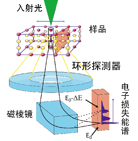 电子束穿过样品时,一部分入射电子与样品中的原子发生非弹性碰撞,引起样品表面电子电离、价带电子激发、震荡等,因而出现能量损失。通过收集这部分非弹性散射电子的信息,便可以得到电子能量损失谱(EELS),获取样品的化学成分、电子结构、化学成键等信息。
