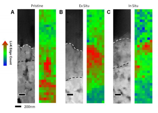 非原位测量结果显示,充电后的无序层发生了岩盐CoO的形成与氧气的释放。然而,原位测量表明在充电过程中,无序层中形成了Li2O或Li2O2中间相。由于氧气析出反应在足够的弛豫时间内发生,因此非原位表征错过了这一步骤。这项工作证明了ASS Li电池在充电过程中的界面层相变机理以及高界面阻抗的起因,展示了原位STEM模式下HAADF成像技术与EELS光谱分析结合的强大功能。
