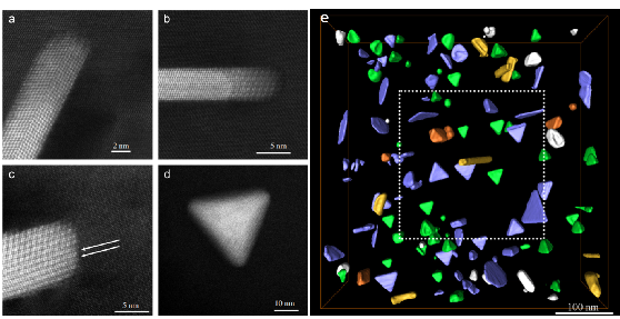 K. Kaneko等人[5]对Al-Ge合金的析出过程进行了原位透射电镜观察,采集了不同深度的STEM-HAADF图像,用来研究析出相界面的原子排列。如图4a所示,在三角板状Ge析出物的横断面处观察到了单双晶和多双晶的存在,4c显示了棒状Ge析出物中多重孪晶的存在。借助3D建模模拟还原了合金中Ge析出相的分布情况。作者在研究过程中发现了棒状Ge析出物的快速粗化现象,并推测其与固溶态Ge的扩散有关。这一发现可以为理解合金中析出相的生长过程开拓新的视野,为有效调控合金的成分及热处理工艺提供参考。