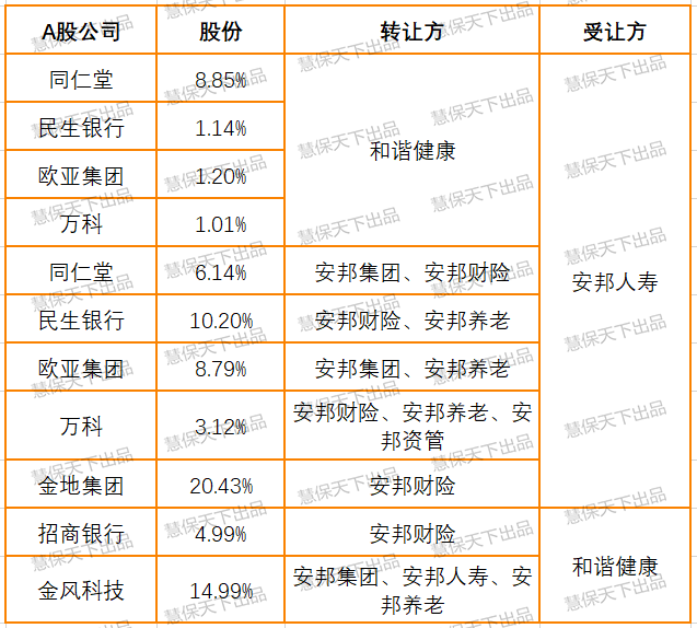 为了合理的处置资产,接管组对所持A股公司的股权进行了大规模内部划转,将大部分股权多次腾挪集中到安邦人寿与和谐健康帐下。