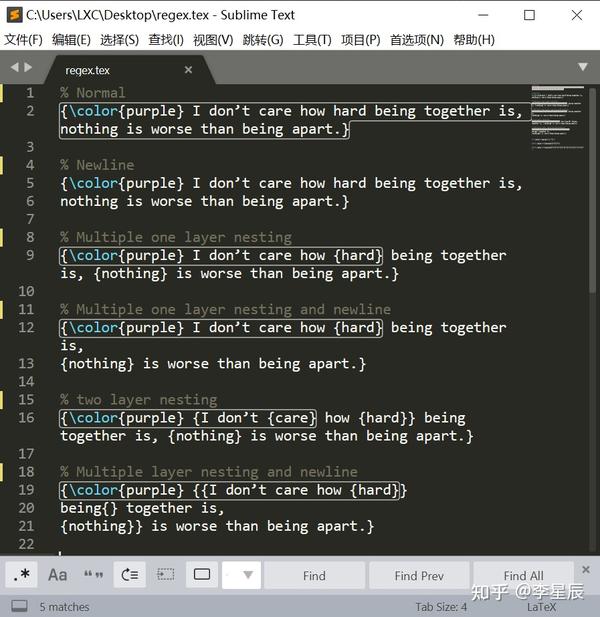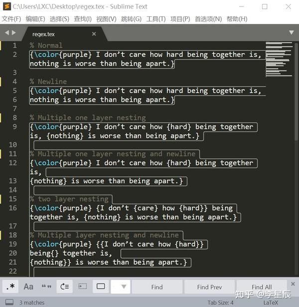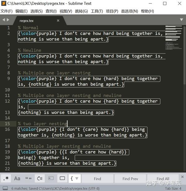 其构造的正则表达式为: \{\\color\{purple\}(.*?)\} ,并将相应文本替换成 $1 。