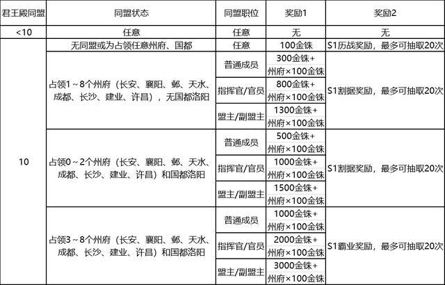 可以看出,在满足条件的情况下可以获得一笔数量可观的金铢奖励,并抽取令人心驰神往的S1赛季奖励卡包。不过,这一切的前提条件是君王殿10级,否则即使你是洛阳+8州府的盟主也仅是一个历战奖励。此外,占据州府和洛阳将直接决定着割据奖励和霸业奖励的区别,而其又与同盟职位共同决定了赛季奖励所获取的金铢数。