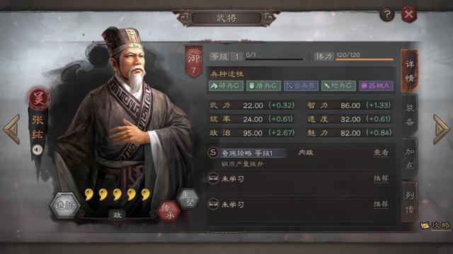 从面板属性来看,92(+2.1)的初始武力属性并不出彩,但95(+1.22)的统率与78(+1.49)的速度属性却是名列前茅,78(+1.29)的智力也保证其比马超更适合主将的角色(不易被爆头)。骑兵S,盾兵枪兵A。