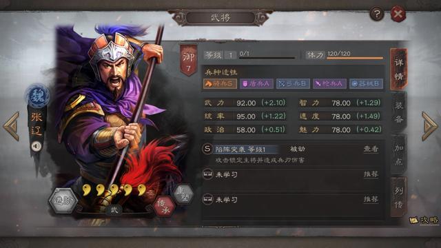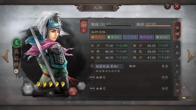看看面板属性,三星武将的档次。枪S骑A。