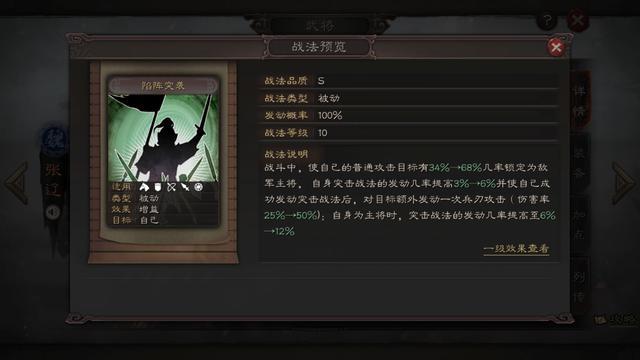 张辽的自带战法陷阵突袭更是如同刽子手、砍头怪一般——高概率锁定敌方主将、提高突击战法发动概率、突击战法之后还跟进一次兵刃伤害。我的天,倘若锁定对手主将,简直不死不休,仿佛让人看到了历史上白狼山袭斩蹋顿,逍遥津八百人险些生擒孙权,让东吴小儿不敢夜啼的张文远。