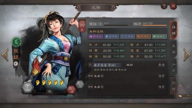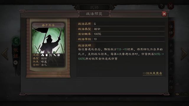 但其战法,偷取对方统率转化为武力,属于越战越勇型的武将。战法虽然在一定程度上弥补奇低的面板属性,但何必占一个战法位去弥补其缺点呢,实在有很多更好选择的武将。同时,虽然张姬战斗中理论上武力越来越高,但普通攻击造成的伤害与兵力也是密不可分的,因此随着回合的增多,兵力的减少,将使攻击越打越乏力。