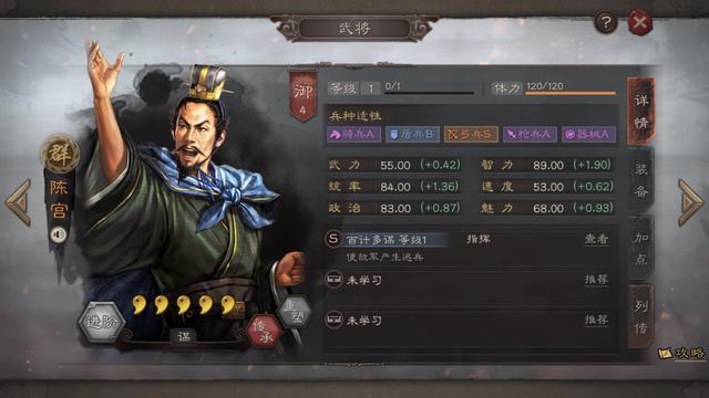 从面板属性来看,98(+2.67)的智力和98(+1.66)的统率放在所有将领中皆可位列三甲,因此司马懿有着出色的综合防御力和谋略输出,无论面对兵刃型队伍还是谋略型队伍都不易被秒杀,适合作为主将。兵种适性更是盾兵枪兵双S,骑兵弓兵器械三A,可谓配将万金油。