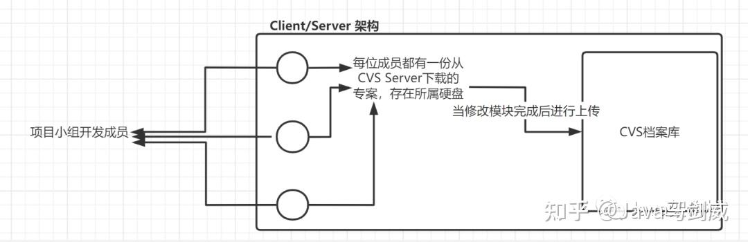 cvs(Concurrent Versions System)是代码管理工具诞生以来,最早出现的一名成员了。不过可惜的是拥有悠久历史的它,不得不在当前的时代浪潮下安静的退出舞台。cvs使用Client/Server架构,项目小组的每一位开发人员都会去记录到一个CVS Server档案库中,当小组项目开发人员编辑完自己的CVS Server后,会将其上传到一个公共的CVS Server档案库中。