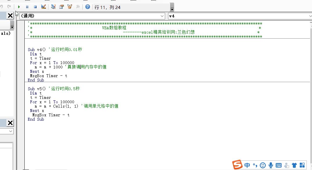 v5:调用 单元格中的值 进行运算,让变量m=m+cells(1,1),运行时间:1.5s