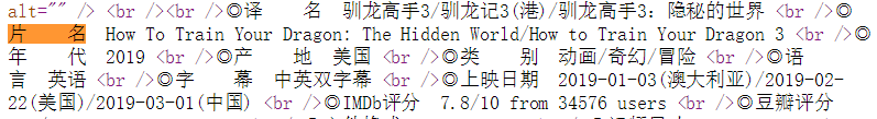 图中可以看到“片名”信息为“◎片 名 How To Train Your Dragon: The Hidden World/How to Train Your Dragon 3 <br />”。于是可以通过正则表达式来定位获取“片名信息”,代码为: