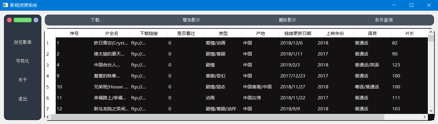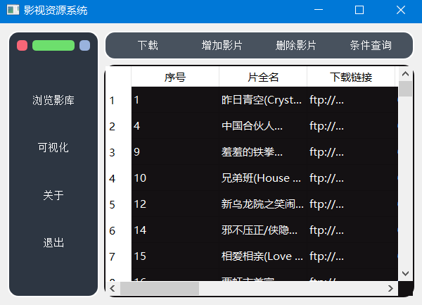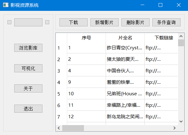 客户端主要功能包括:浏览影库、条件查询、下载、增加影片、删除影片、可视化共6个功能。