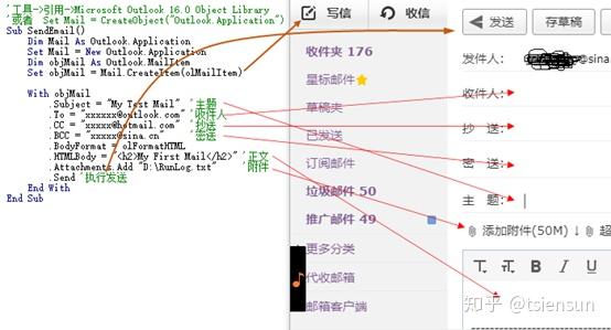 <如代码里注释说明一样,对于Outlook模块的引用,可以用CreateObject的方式实现,这样不用在菜单里进行引用操作,但该方法会使代码编辑缺少必要的提示>