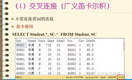 (要统计各分数段人数,要用case+sum来完成,首先用case语句来创建分数段,比如第一个case语句,代表逐行扫描score表每一行数据,找到score>=85就加1(如果满足条件就被认为是1,不满足条件就是0,最后将所有的1和0相加得到的值,就是满足该分数段的学生人数),最后用sum函数来统计这个分数段有多少人,以此类推。为了显示课程名称,还要连接成绩表和课程表,最后用cid进行分组,返回三行结果,显示三门课程的各分数段人数)