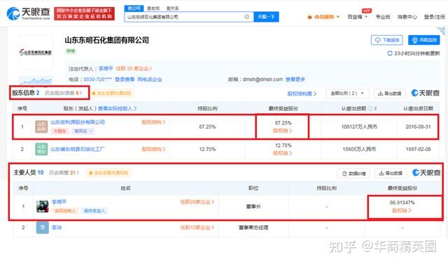 天眼查显示,截止2023年2月26日,李湘平实控的山东宏利源股份有限公司持有东明石化集团87.25%股权。因此,李湘平持有东明石化集团股权占86.91347%,绝对实控人。
