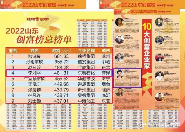 在最新版《2022山东创富榜》中,李湘平以481.31亿元财富位列榜单第4位,排名山东菏泽地区首位,也被称为山东“菏泽首富”。