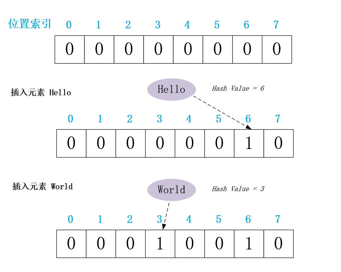 现已向一个Bloom Filter分别插入元素"Hello"、"World"为例,给出其插入过程的图解