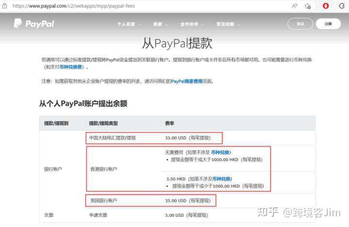 查询 PayPal官网 了解到,PayPal官方支持的提现方式和费率如下图所示: