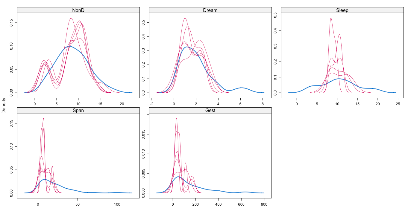 图上,洋红线是每个插补数据集的数据密度曲线,蓝色是观测值数据的密度曲线