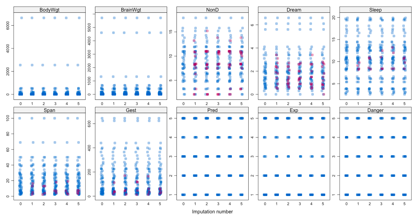 上图中,0代表原始数据,1-5代表5次插补的数据,洋红色的点代表插补值