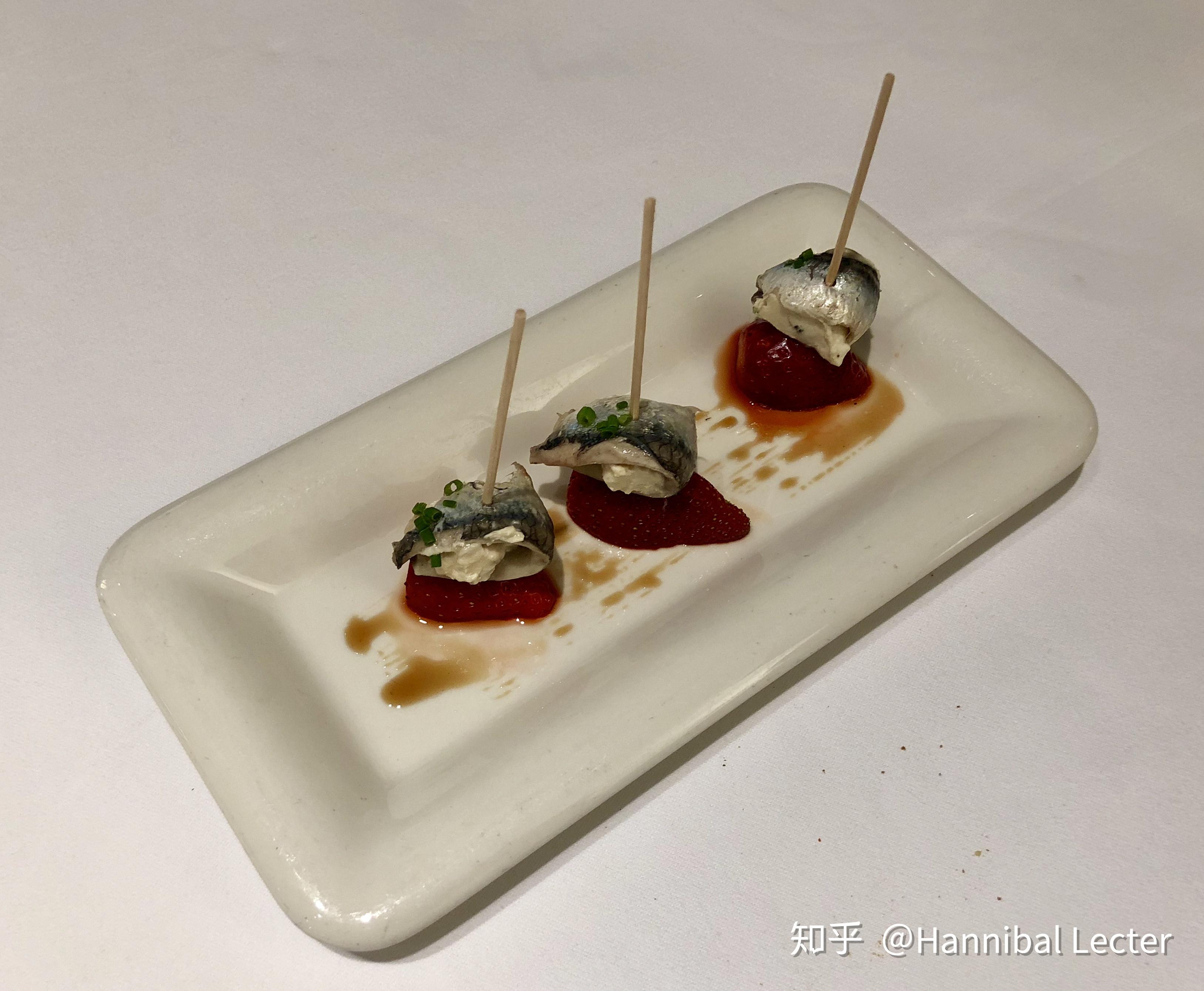凤尾鱼是巴斯克人热爱的海鲜,而草莓是西班牙春季常见蔬果。无论是马德里的塔帕斯还是圣·塞巴斯蒂安宾丘中都有凤尾鱼。一小片带着银色鱼皮,露出鲜嫩白肉的鱼片经过橄榄油的腌渍,被卷曲起来,牙签从正中穿过,将其钉在面包片底座上。唯一的不同在于,阿尔扎克将面包底座变成了对半切开的草莓。