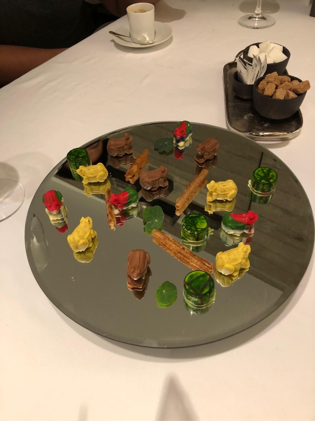 意大利浓缩咖啡香气浓郁,金色镜面圆盘里装着用咖喱、肉桂、牛油果、巧克力四种口味制成的红、黄、绿、咖啡色的小青蛙和漂浮在水面的木棍与荷叶,而小青蛙也是圣·塞巴斯 蒂安这座城市的吉祥物。