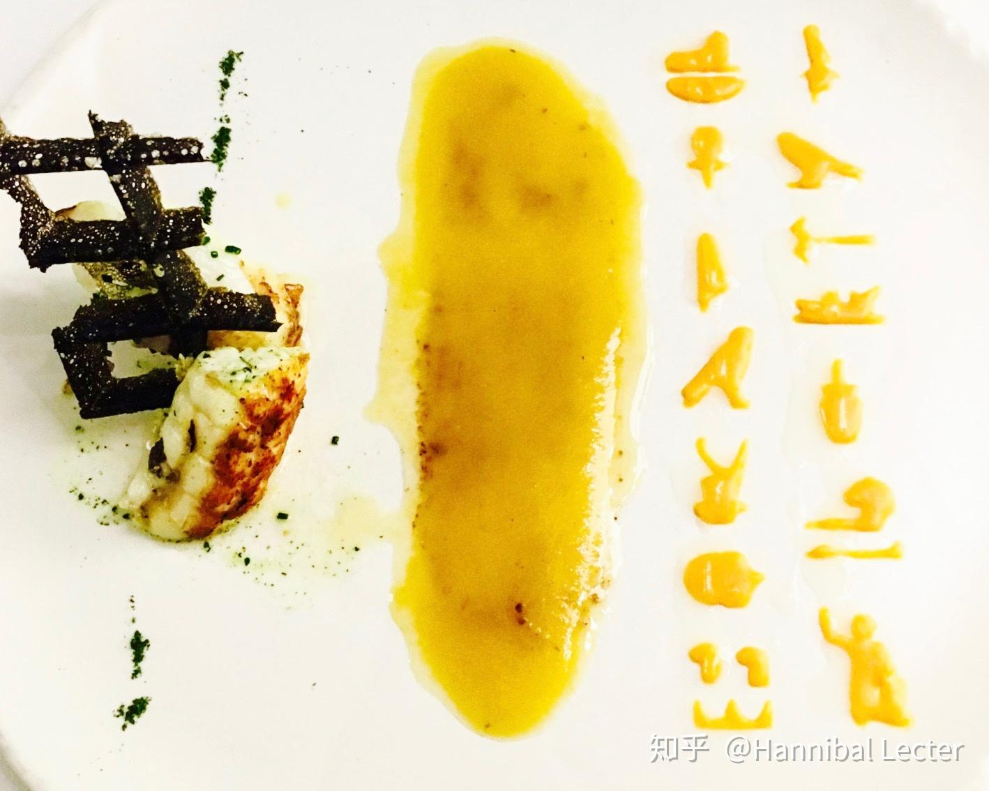 在平底白圆盘右边是用山核桃坚果酱做成的两竖排古埃及象形文字,中间是用鹰嘴豆和南瓜榨汁做成的尼罗河,黄色代表它的泥沙,在河岸两边挂出肥沃的冲击平原。吃之前,侍者拿着银壶和银勺慢慢将“河水”舀入,铺在盘子正中。盘子的左边是烤鮟鱇,切法是滚刀,三角截面被烤得焦黄,象征着金字塔。一块格子状的烤海苔插在其上,不知道是祭神祗时点起的黑烟还是罗马大兵压境时点起的战火。