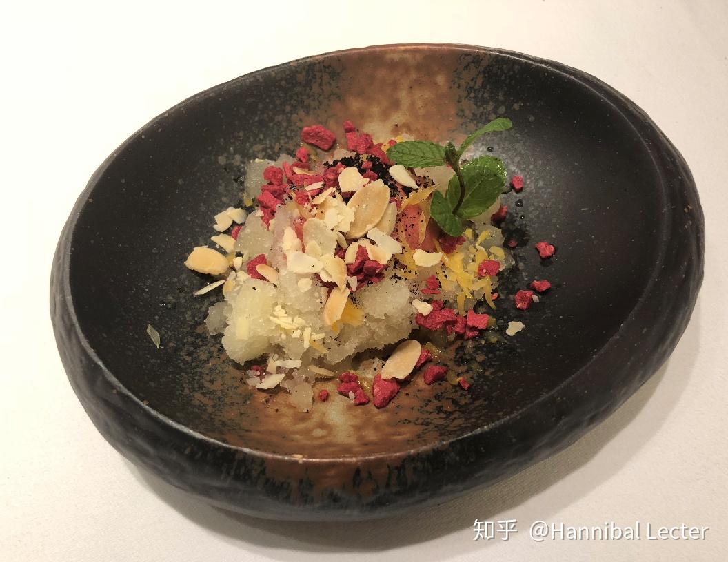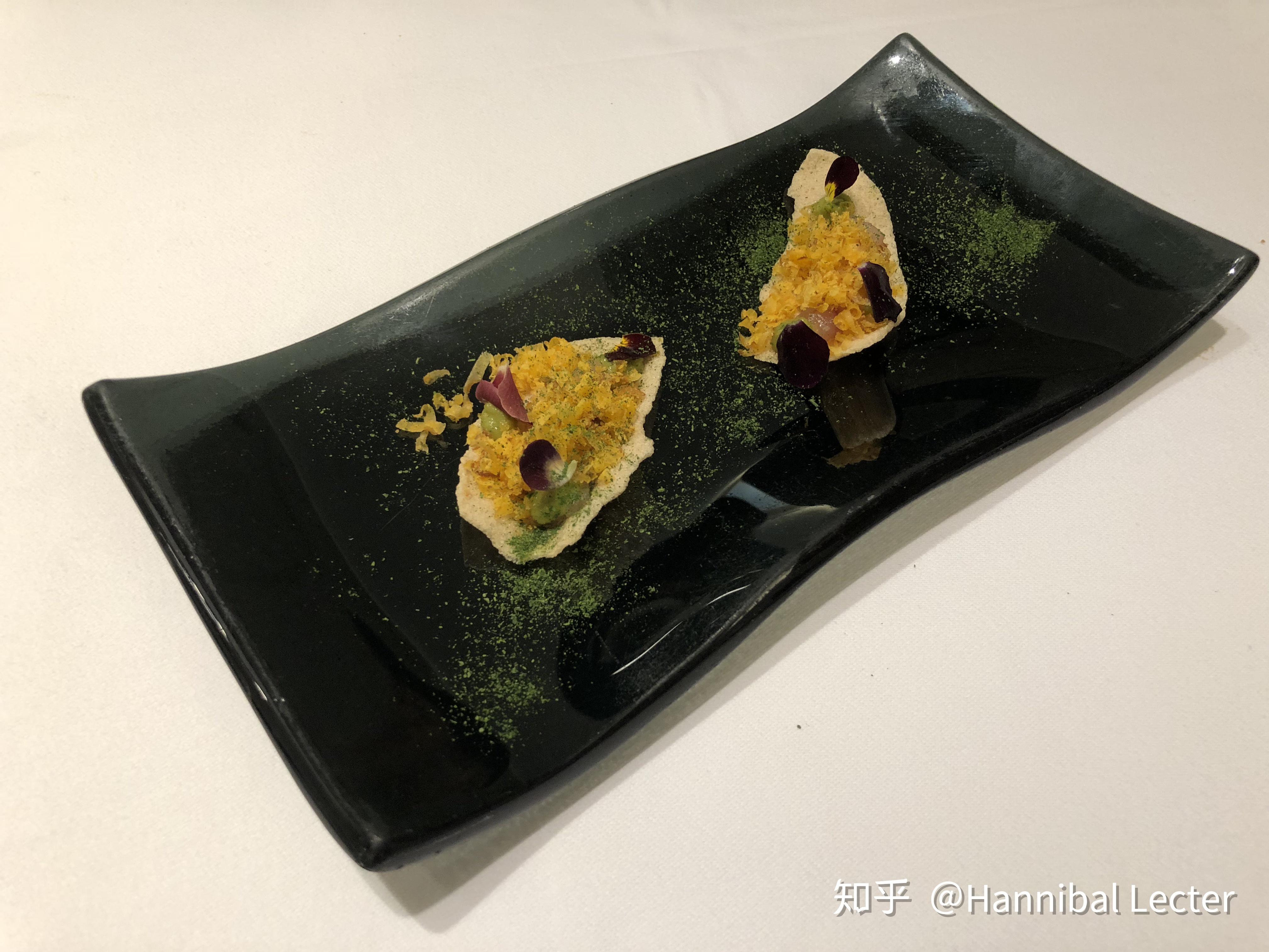 由于吃这道菜的时候我还没有完全进入状态,所以没品出来食材,只是感觉到黑色那部分很有嚼劲,还有一点点粘牙,一口咬下去,混合了酥脆而富有韧性的内瓤,就碰撞出了非常奇特的口感。这道菜分量很小,所以这种黏脆很快就消失了,动员了唇齿和舌头,让人迫切期待下一种体验。
