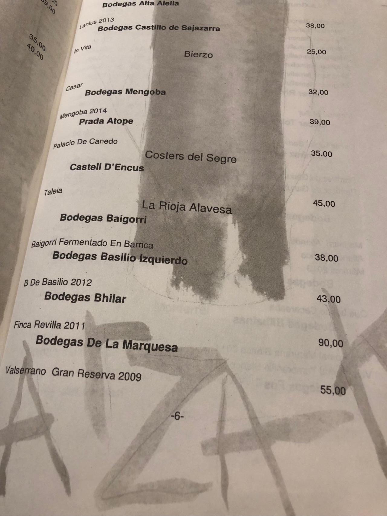 酒保是个快乐的中年大叔,一脸微笑,毛巾搭在左臂,右手托着镀银冰桶。酒单上罗列着几十种进口酒,西班牙本地产红、白葡萄酒和卡瓦,以及品牌香槟,白兰地等。并不懂酒的我们让大叔推荐一款偏甜的白葡萄酒,他没有趁机宰客,而是推荐了一瓶价格亲民,产于巴利亚多利德何塞·巴里恩德酒庄的白葡萄酒。
