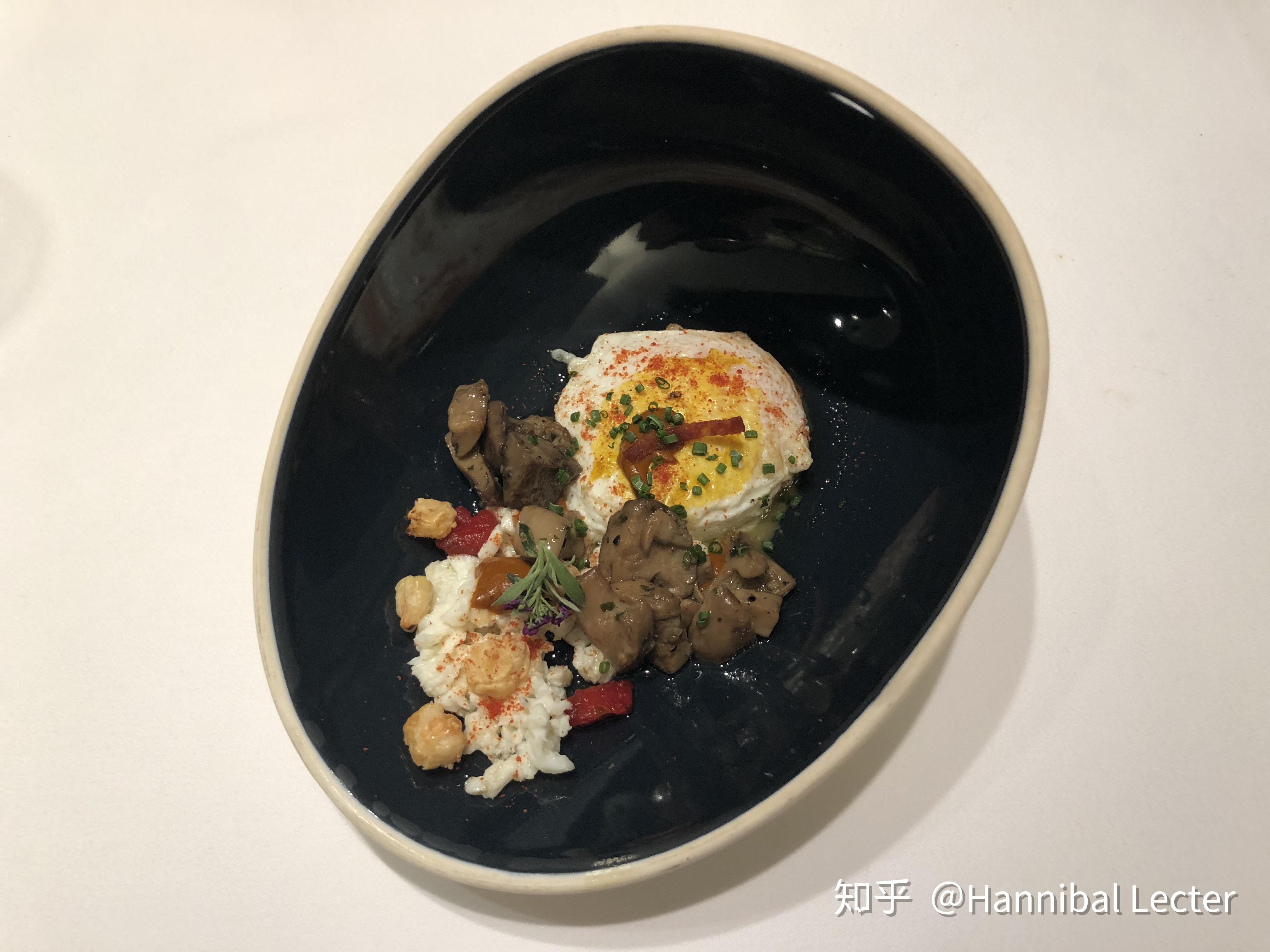 鸡蛋旁边堆放着烤双孢菇瓣,一些蛋白被制成了泡沫,上面撒着像爆米花一样的脆玉米粒和番茄蜜饯。鸡蛋少盐,所以几乎就是蛋香鲜味,蘑菇充分吸收了盐味,而脆玉米,蛋白泡沫和番茄蜜饯微甜,味道完美过渡。