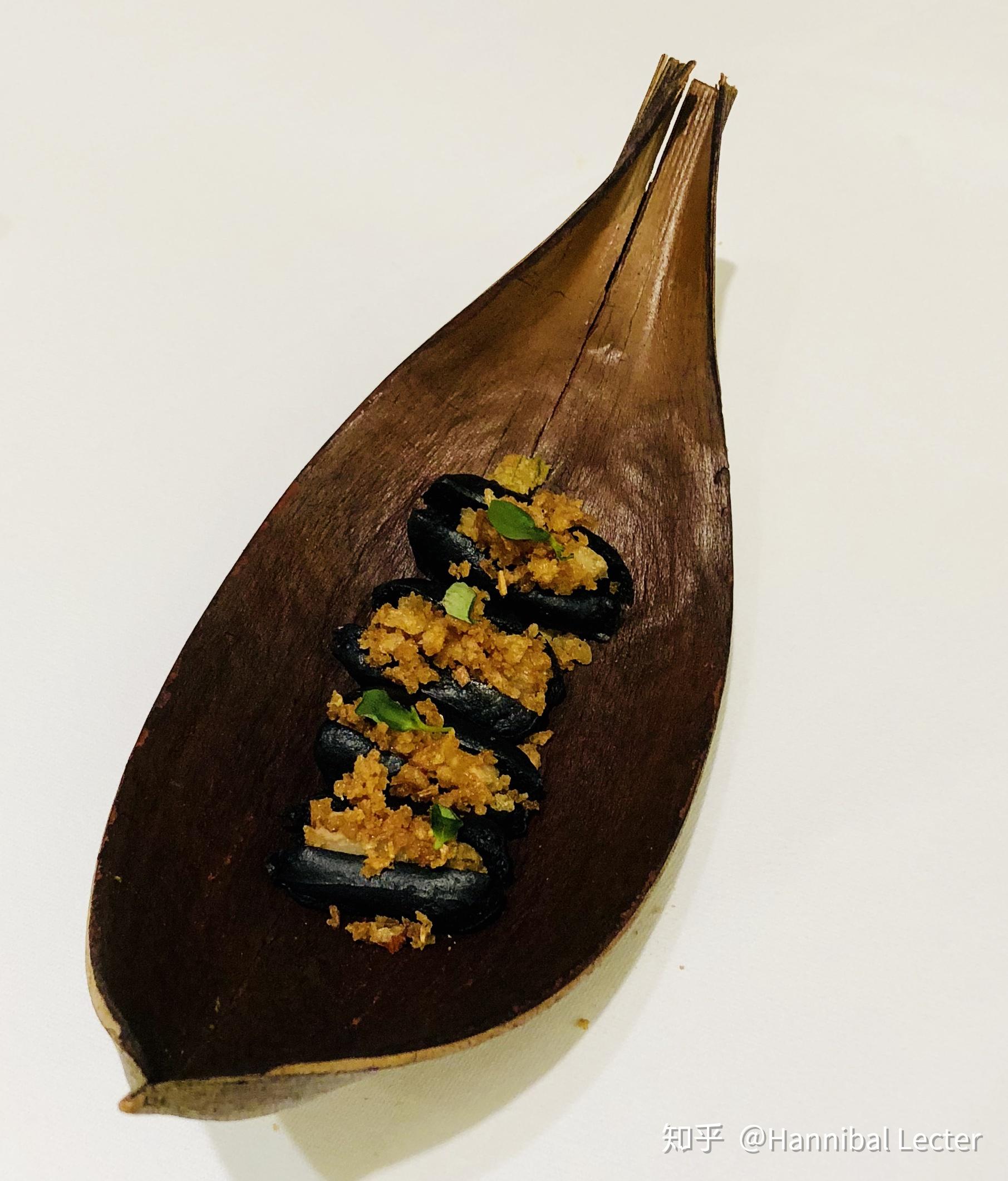 “塔罗”是一种巴斯克特色美食,很像中美洲的传统玉米饼。我觉得做法上它更像是鸡蛋灌饼。制作时,厨师将玉米粉与水混合,再加入少许盐搅拌,然后将面酱涂在温热的金属板上,烘烤成煎饼状。有时候厨师用铁铲将其刮起时圆饼会自然卷边,它的造型便很像一只距骨。人们习惯在“距骨”的中心放上沾满酱汁的腊肠。在阿尔扎克的这道菜中,一片咖啡色的干树叶代替了塔罗玉米饼,里面并排盛放着四个外形酷似橄榄,又像海虹,或是甜枣,而颜色发黑的颗粒,中间撒着金黄色的油炸碎末。像一排热狗。
