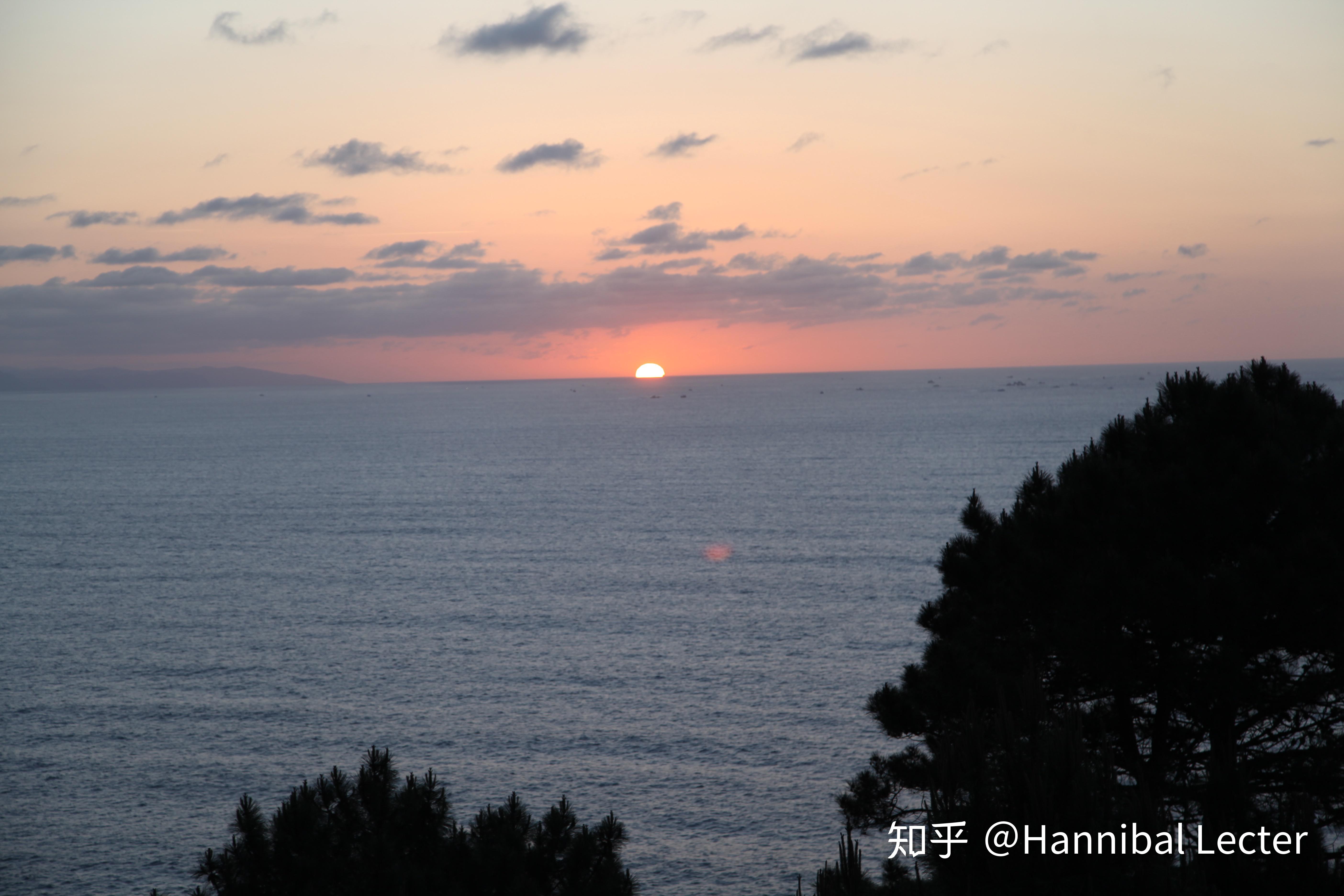 水泥护栏外,是大片的松林和刀砍斧削的悬崖,海浪拍击着岩石,发出轰隆巨响。四月末的欧洲多有云雾,铅灰色的云团把天压得很低,就在这深沉肃穆的画布上,即将消失在水天一线的落日把四周染得一片绯红。远处的海面上,波光粼粼,靠近落日的水域,有无数斑驳的黑影在晃动,那是一艘艘船在聚集。想必那船上也有人和我们一样,沐浴着夕阳温暖的光。