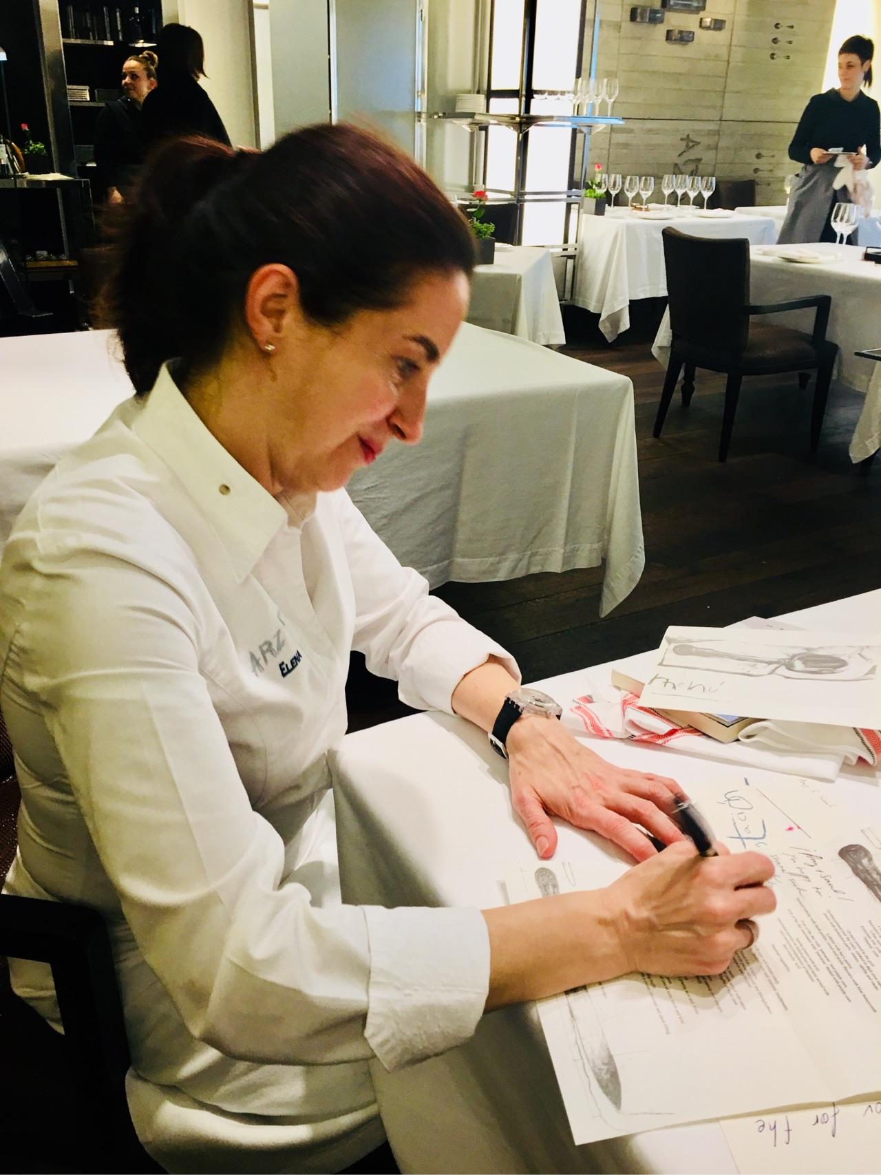 当我们起身准备付钱的时候,服务员微笑着给我们比了个手势让我们坐下,这时候Elena从后厨出来,站到我旁边,对我说,以后欢迎你常来,然后坐下来很有耐心的给我们每个人签字——