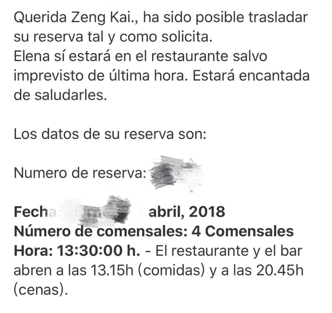 四月初,我从马德里打电话到餐厅预订,结果前台告诉我需要网上预订,于是我在网上预订,填写了个人信息,卡号,预订信息。一两个小时候得到回复——
