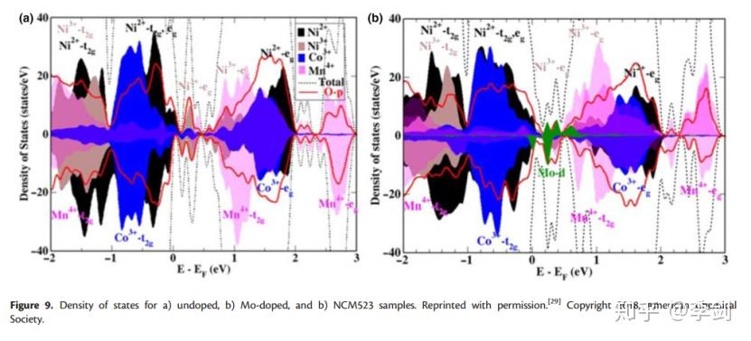 DOS本质上是允许电子占据的特定能级上不同状态的数量,即每单位体积每单位能量的电子状态的数量。根据最近的DOS分析,Breuer等证实了在LiNi0.5Co0.2Mn0.3O2(NCM523)中掺杂Mo6 +会影响其电子结构,从而影响LiBs中的电化学性能。未掺杂和掺杂Mo的NCM523的DOS计算结果如图10所示。尽管掺杂Mo后DOS没有明显变化,但是Ni2 +部分DOS(PDOS)的增加和Ni3 + PDOS的相应减少证明了Ni3 +的电荷补偿。此外,基于计算和实验结果,接近Femi级的Mo6 +导带增加了NCM523的电导率,Mo PDOS的位置也解释了电池循环过程中Mo5 +和Mo6 +的出现。