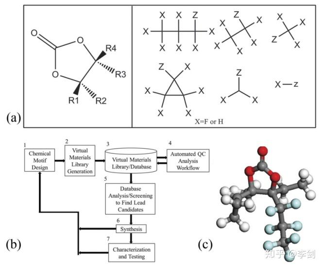 图64 为利用高亲电性及低化学硬度为描述因子对EC的含F衍生物及烷基衍生物进行的高通量筛选研究。a EC核心结构(左图)和R组结构(右图)用于枚举结构库,其中Z表示连接点; b筛选工作流程; c筛选出一种典型的高效添加剂,其配色方案与表1相同,F原子表示为浅蓝色(版权所有:Elsevier B. V.)